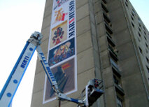 Pubblicitari, per manifestazioni ed eventi. Nessun limite di dimensione. Installazione con autogru. Stampa massima qualità. Molteplici materiali in pvc frontlit o mesh (microforato anti-vento), backlit (retroilluminabile), canvas o flag.
